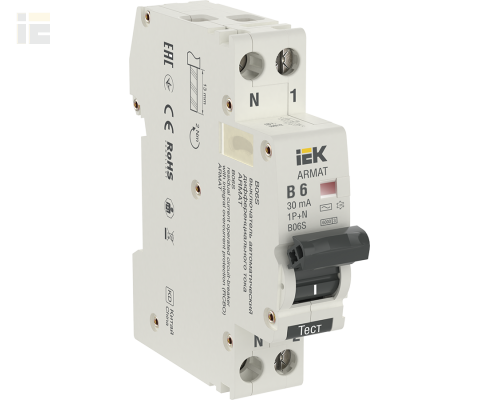 Автоматические выключатели дифференциального тока (АВДТ) ARMAT серии B06S могут осуществляют функции защиты от токов перегрузки и короткого замыкания и защиты человека от токов замыкания на землю. Модельный ряд включает в себя устройства с номинальными токами от 6 до 32 А, характеристиками срабатывания по сверхтоку B и C, типами защит AC и A с номинальным дифференциальным током отключения 30 мА. Номинальная отключающая способность АВДТ ARMAT серии B06S составляет 6 кА.