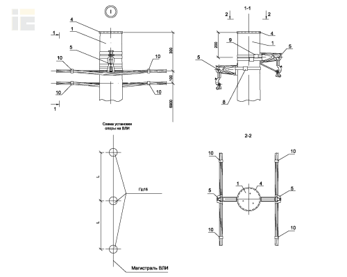 В составе проекта разработаны деревянные опоры ВЛИ 0,4кВ в соответствии с требованиями ПУЭ 7 издания. Опоры ВЛИ 0,4кВ разработаны на базе деревянных стоек длиной 9,5м, 11м, 12м. Одно и двухцепные опоры могут применяться в I-IV районах по ветру и гололёду. На всех типах опор предусмотрена возможность ответвления к вводам в здания в одну и в две стороны от ВЛ двух, четырех и 2х2 жил СИП.