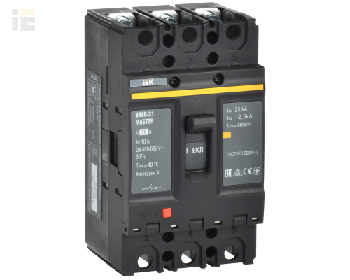 Автоматический выключатель в литом корпусе ВА88 MASTER предназначен для защиты электрических сетей от токов короткого замыкания, токов перегрузки, недопустимых снижений напряжения, а также для проведения тока в нормальном режиме. Автоматические выключатели производятся в 6 типоразмерах, оснащены комбинированным расцепителем (тепловой и электромагнитный) на токи от 20 до 800 А. Рабочее напряжение до 690 В. Конструкция автоматического выключателя предусматривает возможность самостоятельной установки дополнительных устройств на объекте заказчика.